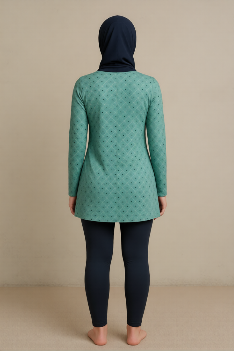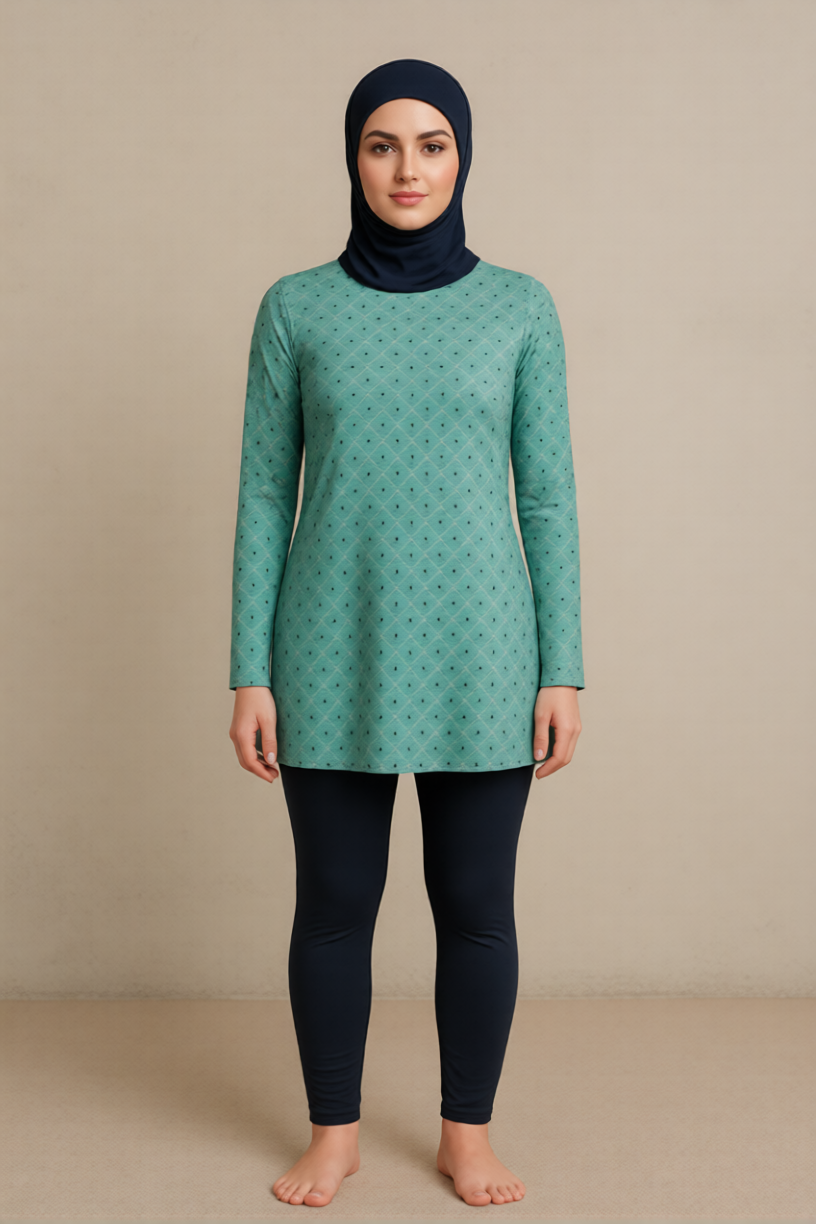 Patron de burkini alliant  élégance, confort et modestie dans un design contemporain. L’ensemble se compose d’une tunique à manches longues avec col montant. Elle est assortie à un pantalon style legging.