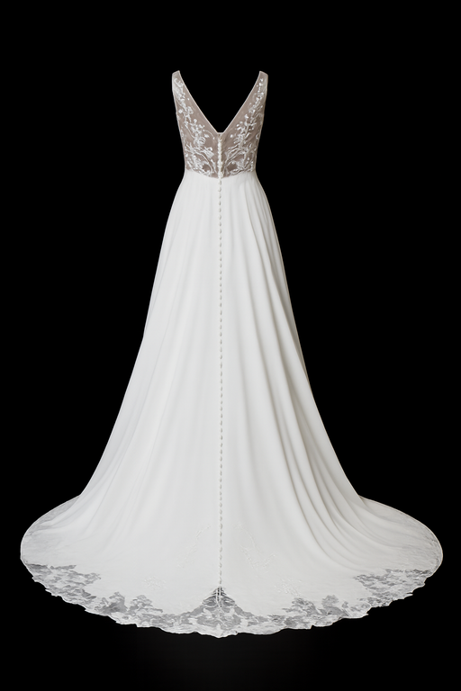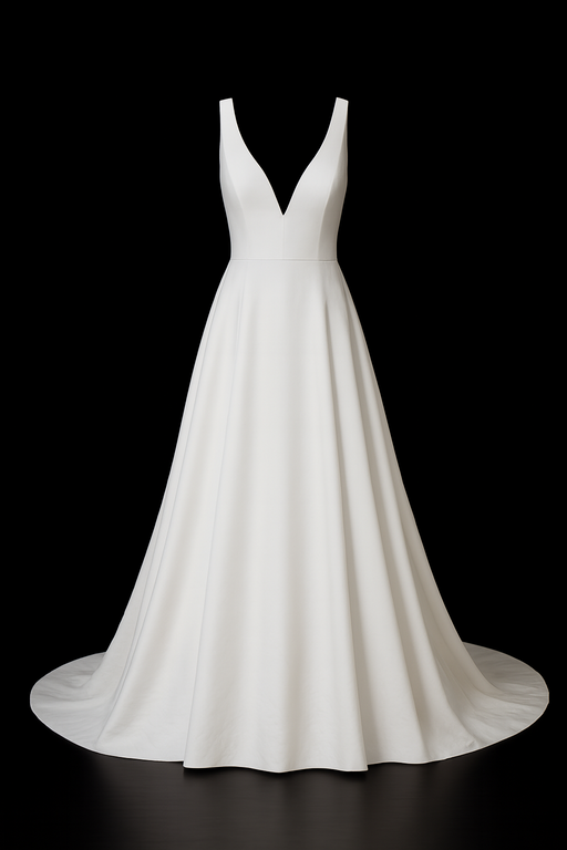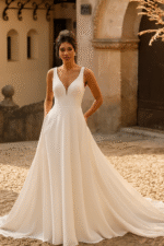 Cette robe de mariée sublime la silhouette avec une coupe épurée et majestueuse. Le décolleté profond en V, encadré par de larges bretelles, met en valeur le port de tête avec raffinement. Le bustier ajusté épouse le corps avec précision, soulignant la taille avant de s’ouvrir sur une jupe ample et fluide.